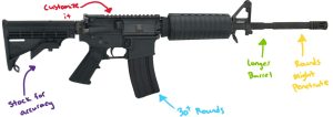 What’s the deal? The AR-15 is the versatile, high-tech marvel of the gun world. It’s semi-automatic, meaning you’ll get one shot per trigger pull, and it’s customizable to fit your preferences.